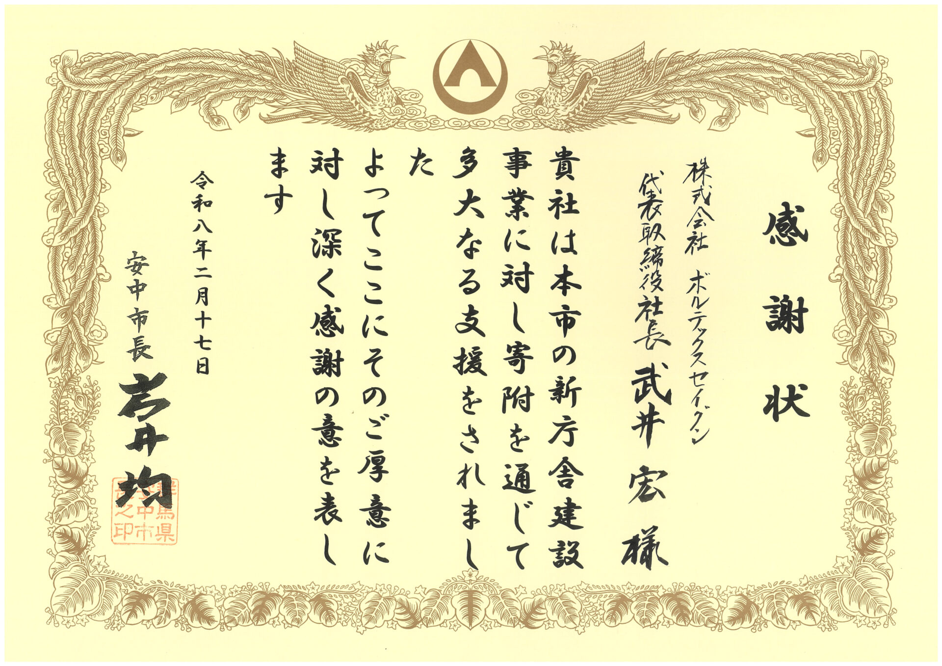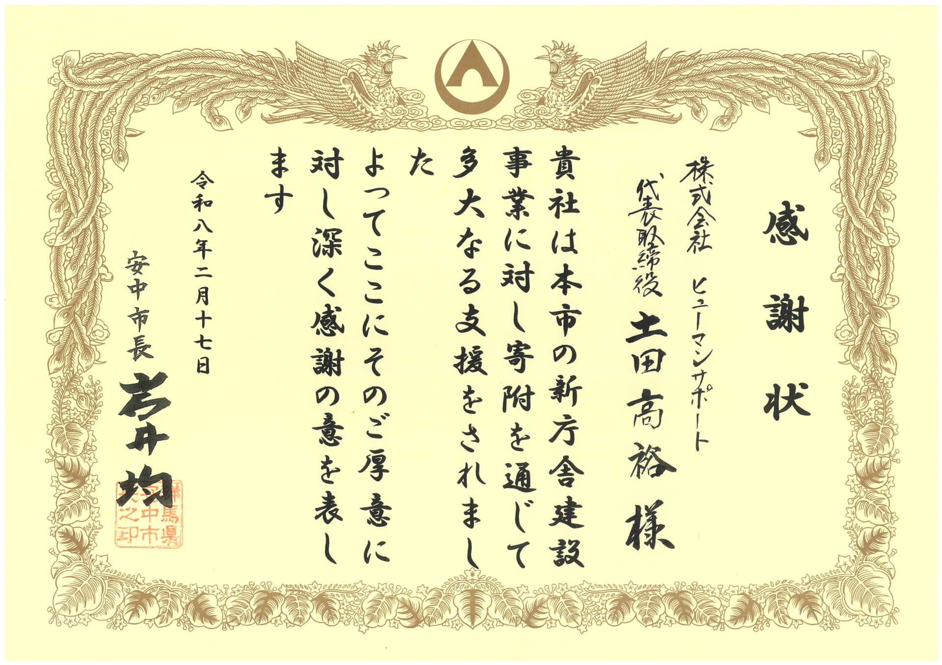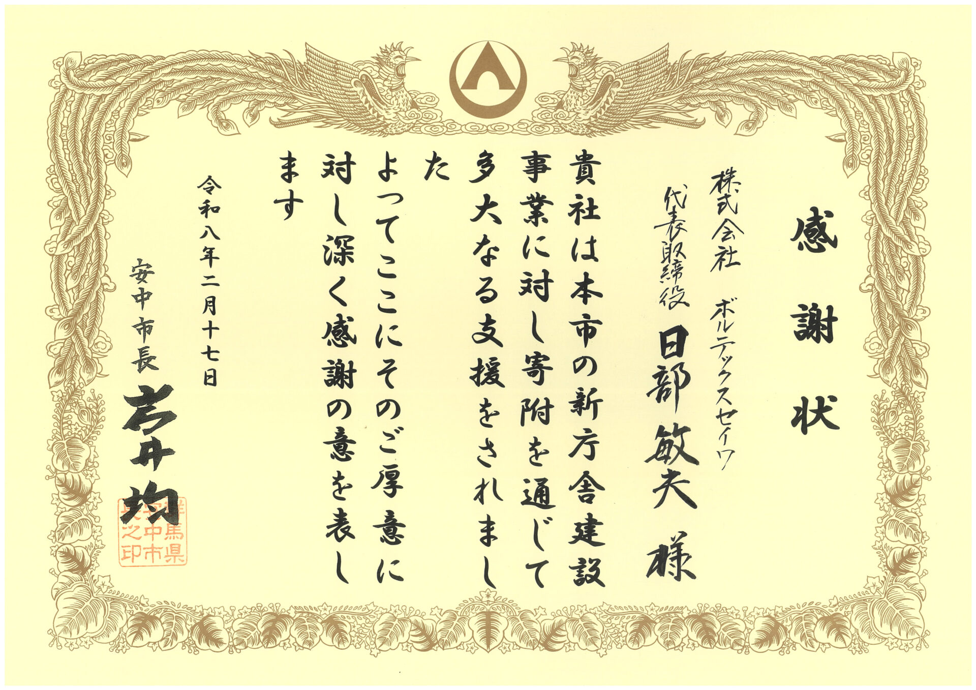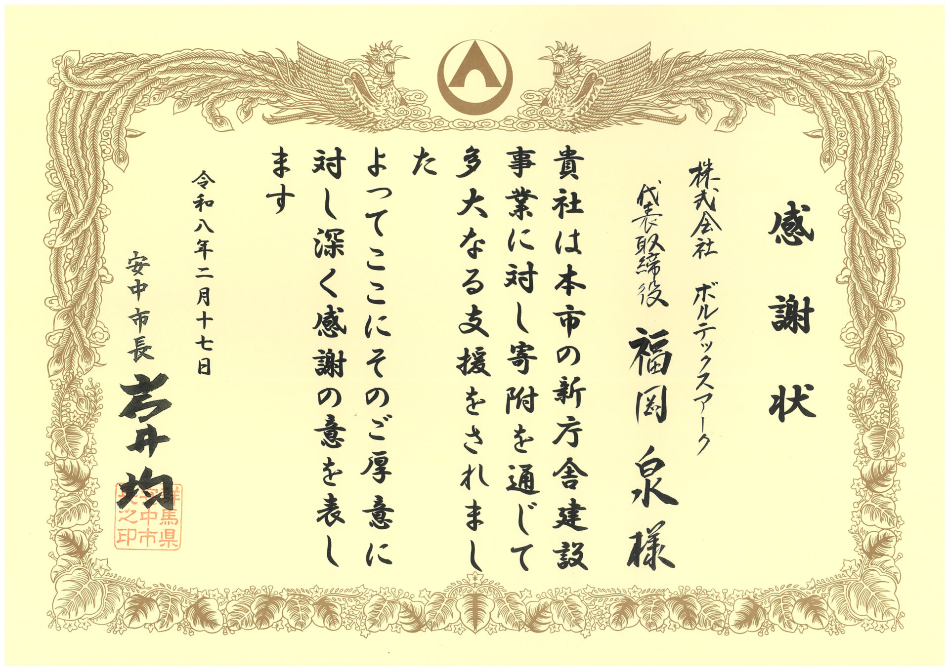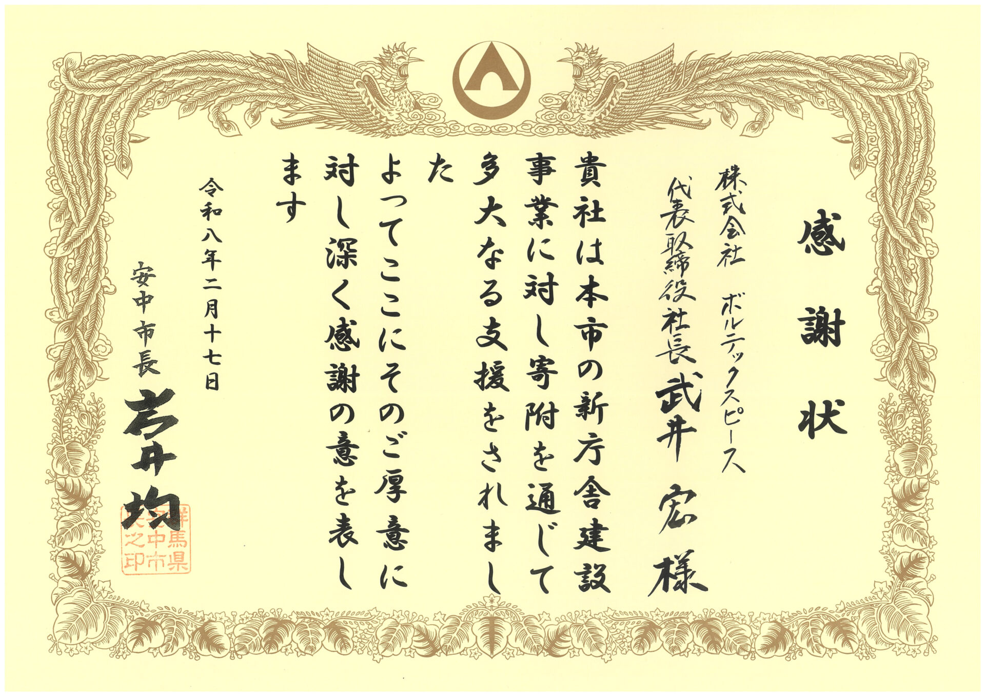2026年2月17日、安中市役所本庁舎にて『安中市新庁舎建設事業に対する感謝状贈呈式』が行われ、安中市 岩井市長より感謝状をいただきました。