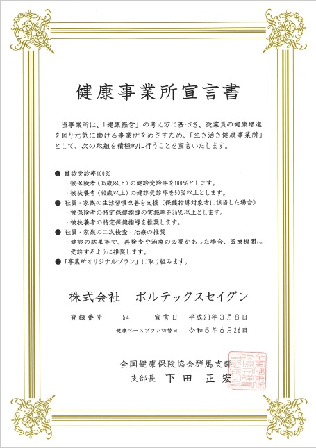 全国健康保険協会群馬支部(協会けんぽ)へ健康事業所宣言をいたしました